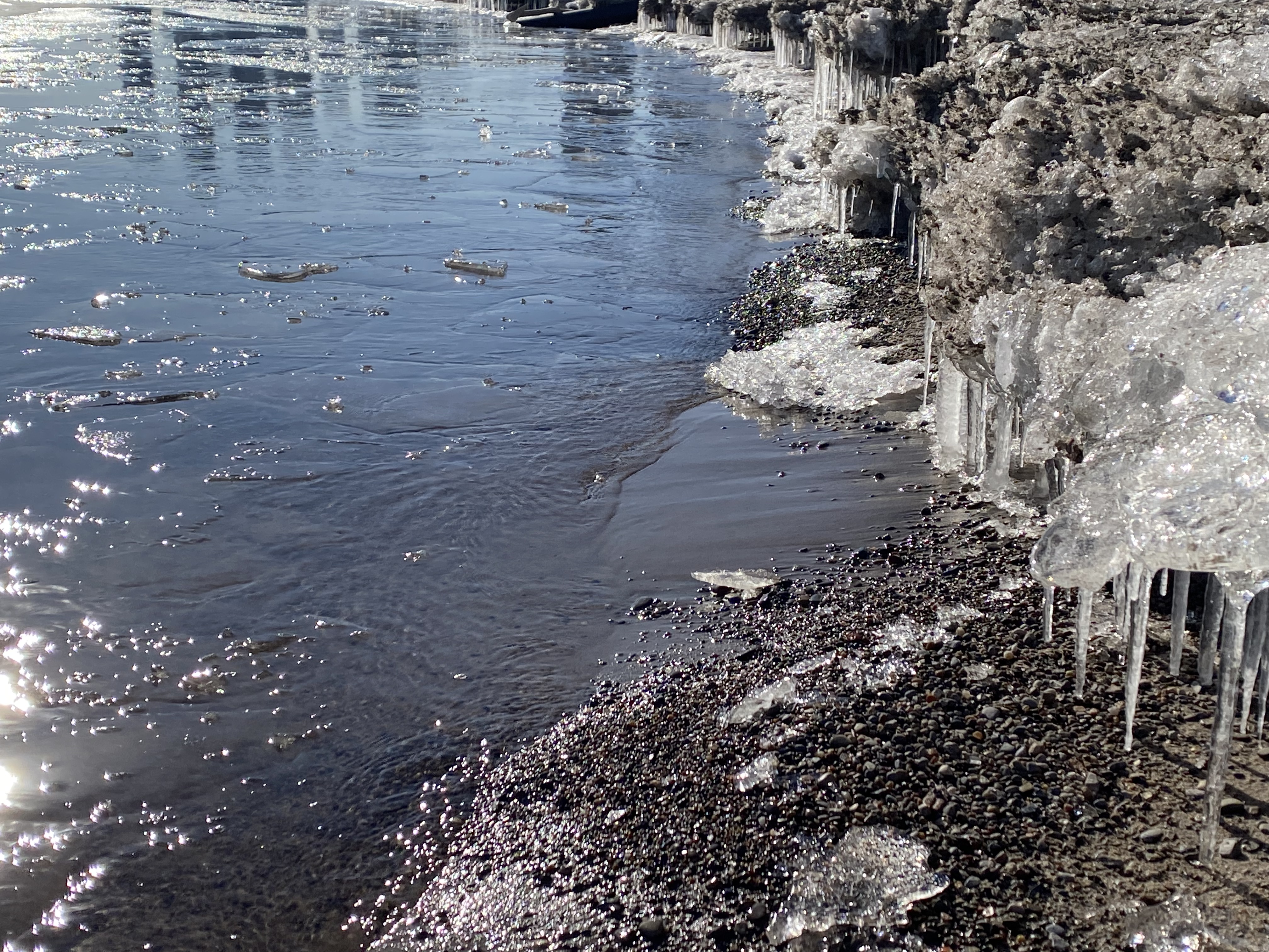 Down at the water’s edge - even though it was a really cold day it’s still not completely frozen at the shoreline. And look, you can even see a bit of sand on the beach!